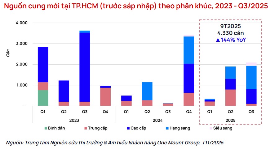 Ngược lại, TP.HCM lại cho thấy nhịp phục hồi nhanh và rõ nét hơn. Sau khi hàng loạt vướng mắc pháp lý được tháo gỡ, nguồn cung trong 9 tháng đầu năm bật tăng lên 15.410 căn, tăng 252% so với cùng kỳ; lượng tiêu thụ đạt 16.240 căn, tăng 114%. Các dự án trung tâm, dù có mức giá sơ cấp từ 130–140 triệu đồng/m², vẫn ghi nhận sức mua tốt, cho thấy tâm lý thị trường đã cải thiện mạnh sau thời kỳ trầm lắng.